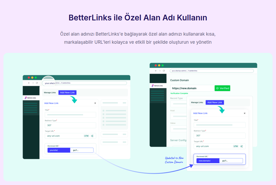 Markalaşmanızı bir adım öteye taşımak ister misiniz? BetterLinks Pro, kısaltılmış bağlantılarınız için ana sitenizden farklı bir özel alan adı (örneğin, markam.link/firsat) kullanmanıza izin verir. Bu, özellikle sosyal medyada paylaşılan linkler için son derece profesyonel bir görünüm sunar.